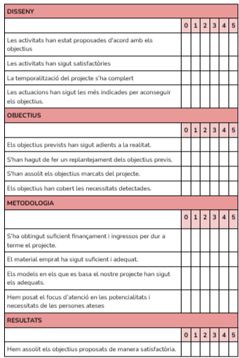 S'han realitzat autoavaluacions i avaluacions internes per part del personal, així com avaluacions dels usuaris per mesurar la satisfacció i la qualitat del servei prestat. Finalment, s'han dut a terme avaluacions inicials, formatives i finals, tant quantitatives com qualitatives, per garantir una intervenció eficaç i la millora contínua del centre.